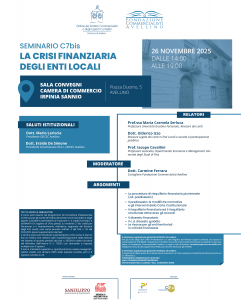 Mercoledì 26 novembre 2025, presso la Sala Convegni della Camera di Commercio Irpinia Sannio, Piazza Duomo 5 – Avellino, dalle ore 14.00 alle ore 19,00  l’evento “La Crisi Finanziaria degli Enti Locali”.  Solo per coloro che sono iscritti ad altri ODCEC territoriali oppure al solo Registro dei Revisori Legali è richiesto l’invio della Scheda di partecipazione con allegato bonifico bancario di euro 50,00, in allegato locandina con domanda di partecipazione (solo per gli esterni). L’evento è condiviso con il Ministero dell’Interno per l’Iscrizione nel Registro dei Revisori degli EE.LL. oltre che accreditato ai fini della FPC obbligatoria per n.5 crediti formativi. Al termine dell’evento saranno somministrati i test di verifica validi per il riconoscimento di n.5 crediti formativi, utili per l’Iscrizione nel Registro dei Revisori degli EE.LL.